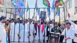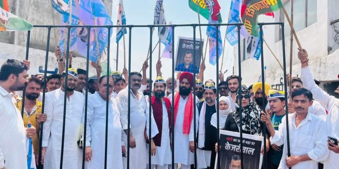 आप कार्यकर्ताओं ने मॉक जेल की सलाखों के पीछे खड़े होकर किया विरोध-प्रदर्शन, राष्ट्रपति को सम्बोधित ज्ञापन एसडीम सदर को सौंपा।